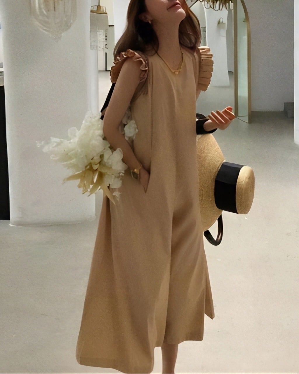 フリルショルダーがとってもかわいいワイドオールインワン。パンツスタイルながら、フリルショルダーが女性らしい印象を引き出してくれます。ワイドパンツということで、動きやすくゆったりとした着心地が魅力的です。